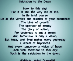 The Sanskrit poem, “Salutation to the Dawn”, is on my mind this morning. I have been feeling drenched in sadness and confusion the last couple of days and this is a prayer/poem which often has helped me to get through rough times and restore hope. I notice that it does not insist on smiles and a cheery façade. The happiness is brought up only as part of the reflection on yesterday, leaving time and space to get there. Anyway, to me the mention is of an all- around, well- being kind of happiness, which allows for grieving. It also probably allows for petty grievances and mistakes, because we need those to grow too.
